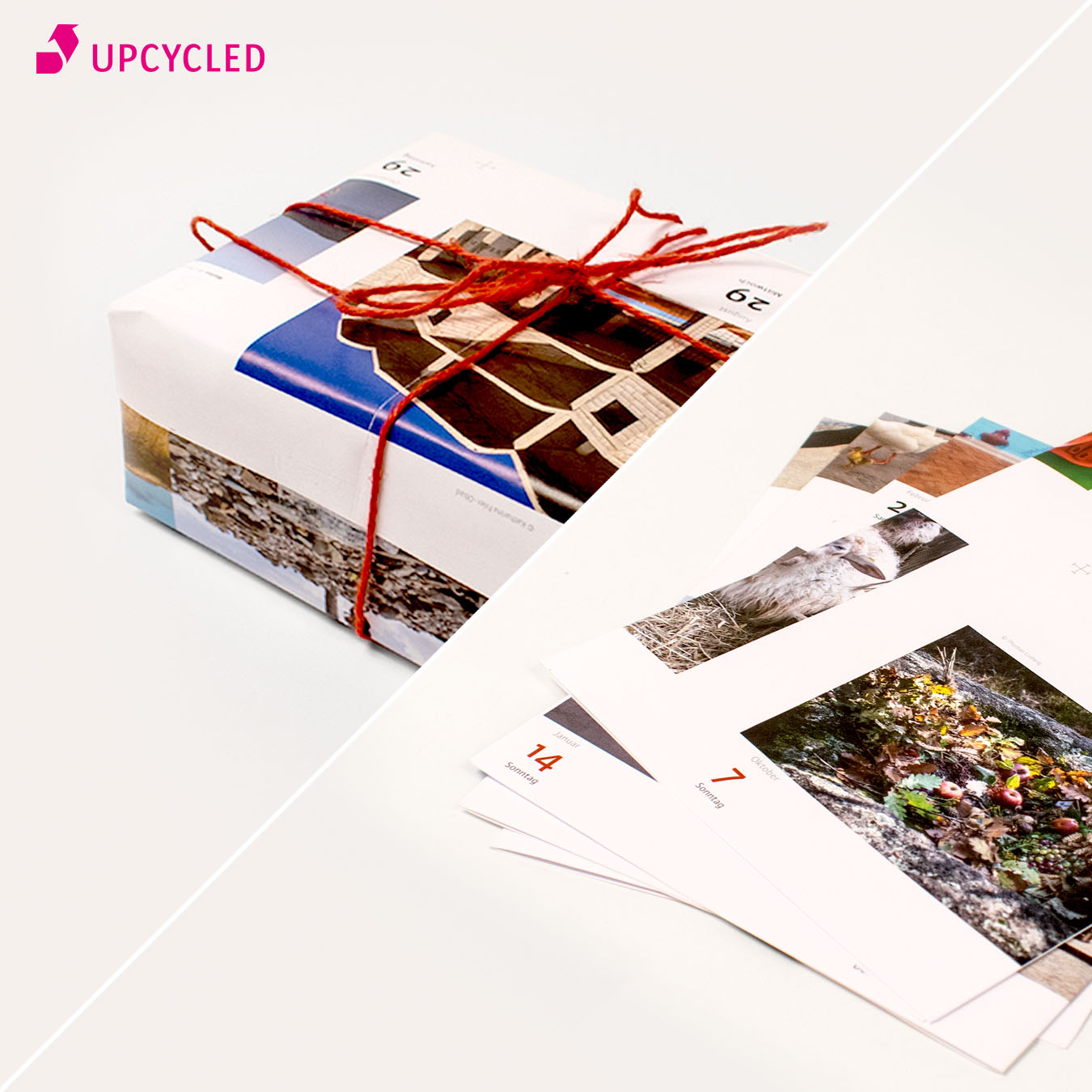 Mit BLINK-Fotos umwickelt werden Geschenke bunter. 4 gefaltete Bögen aus ehemaligen BLINK-Druckbögen – perfekt, um einen BLINK-Kalender zu verpacken.