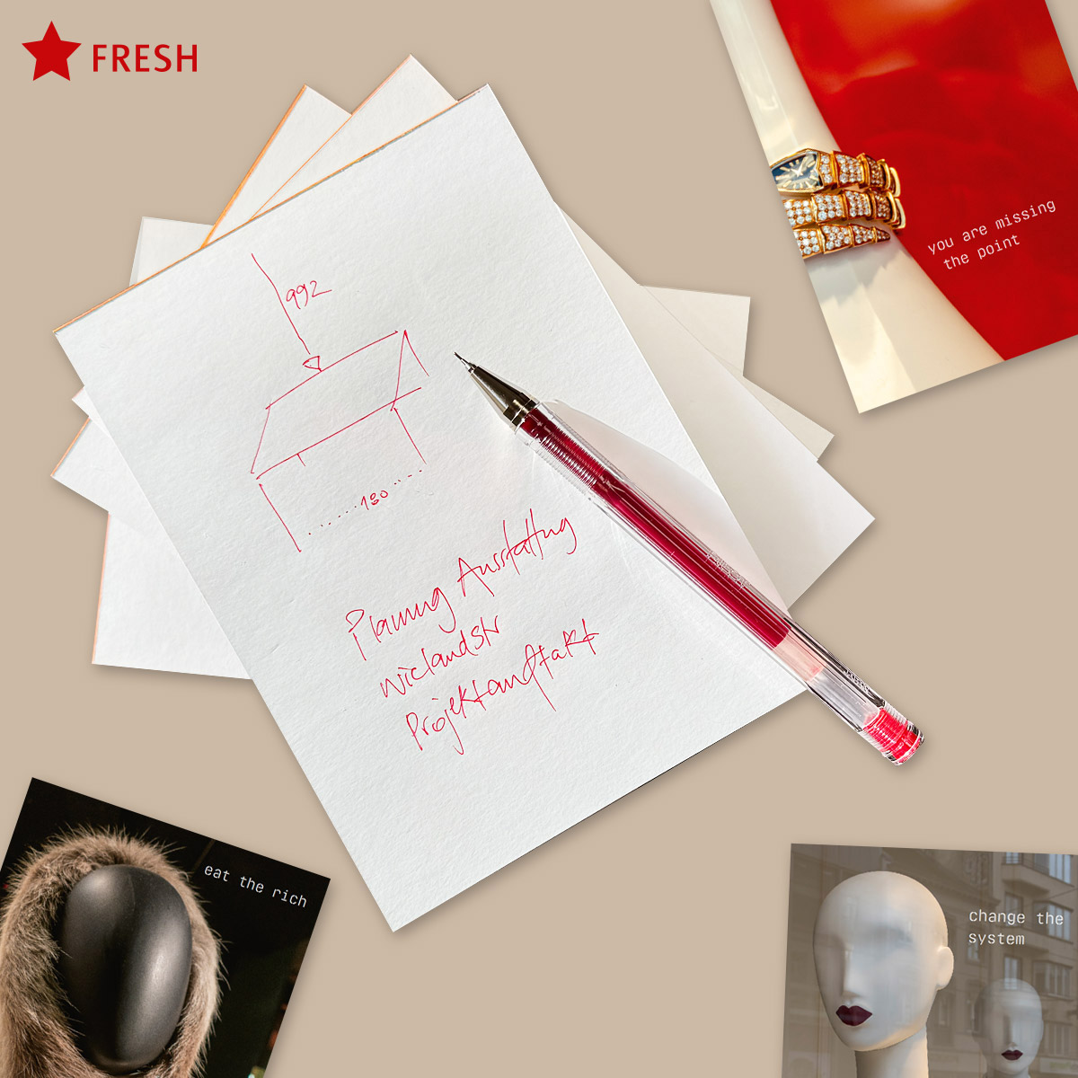 Schreiben und Notieren! Ein trojanisches Pferd: Was wie ein Block voll weißer Notizblätter daherkommt, entpuppt sich bei näherer Betrachtung als Botschaft für eine solidarische Verteilung unseres Reichtums: Auf der Rückseite kombinieren wir Bilder vom Luxus in den Schaufensterauslagen unserer Konsummeilen mit unseren Wünschen für die Welt: EAT THE RICH und LET THE RICH PAY als Analogie für die Verteilung des bisweilen obszönen Reichtums einzelner Menschen, CHANGE THE SYSTEM als Bild für eine neue Zeit, ALL WE NEED IS LESS als Erinnerung an bewussten Konsum.