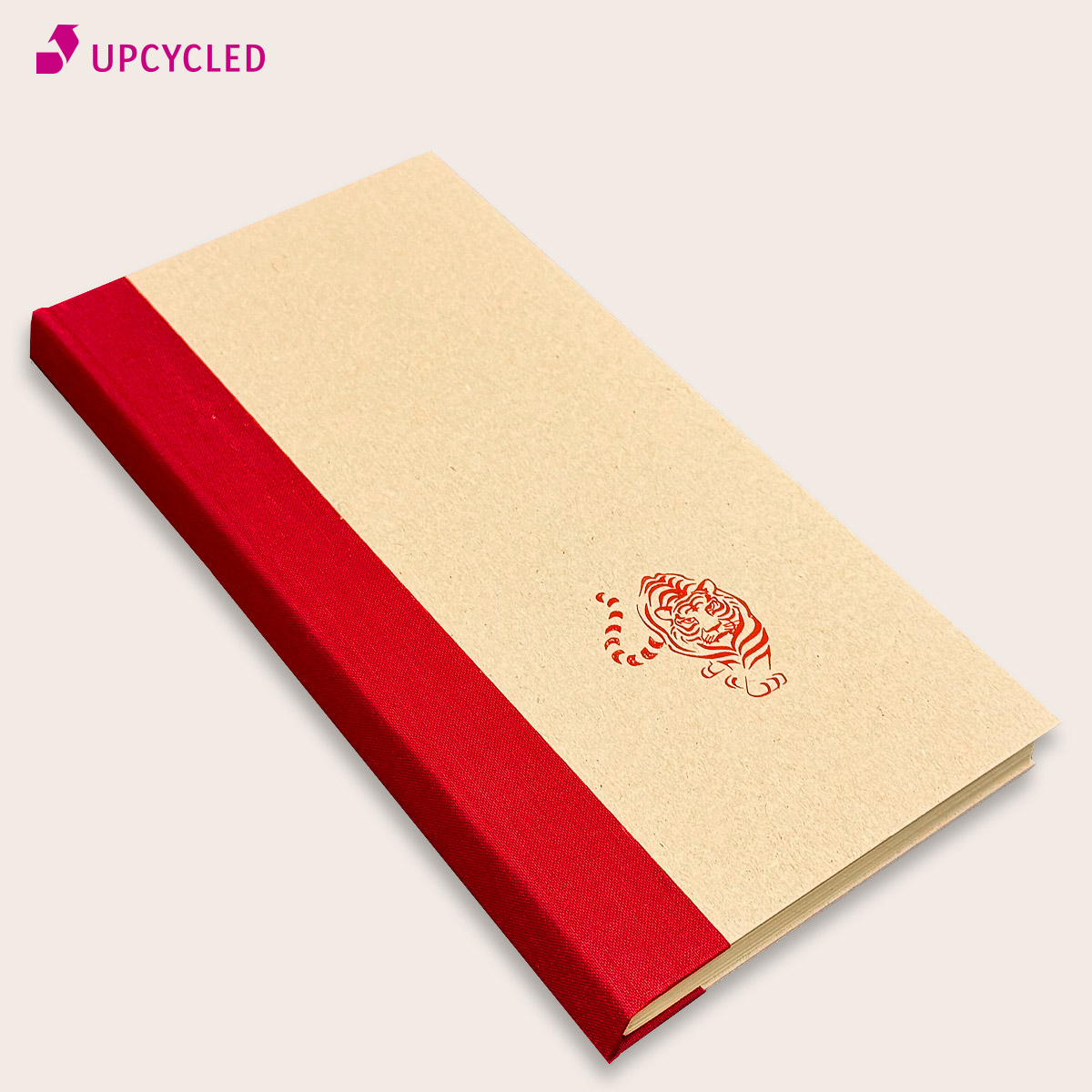 Das hochwertige Notizbuch mit fadengehefteter Schweizer Broschur bietet feinste Hanfpapier-Reste, die wir vor dem Papiermüll gerettet haben. Umhüllt von einem Umschlag aus Graupappe mit Tigermotiv in roter Folienprägung. Auf der Umschlaginnenseite nimmt eine Tasche lose Blätter auf. Recycling von der schönsten Sorte.