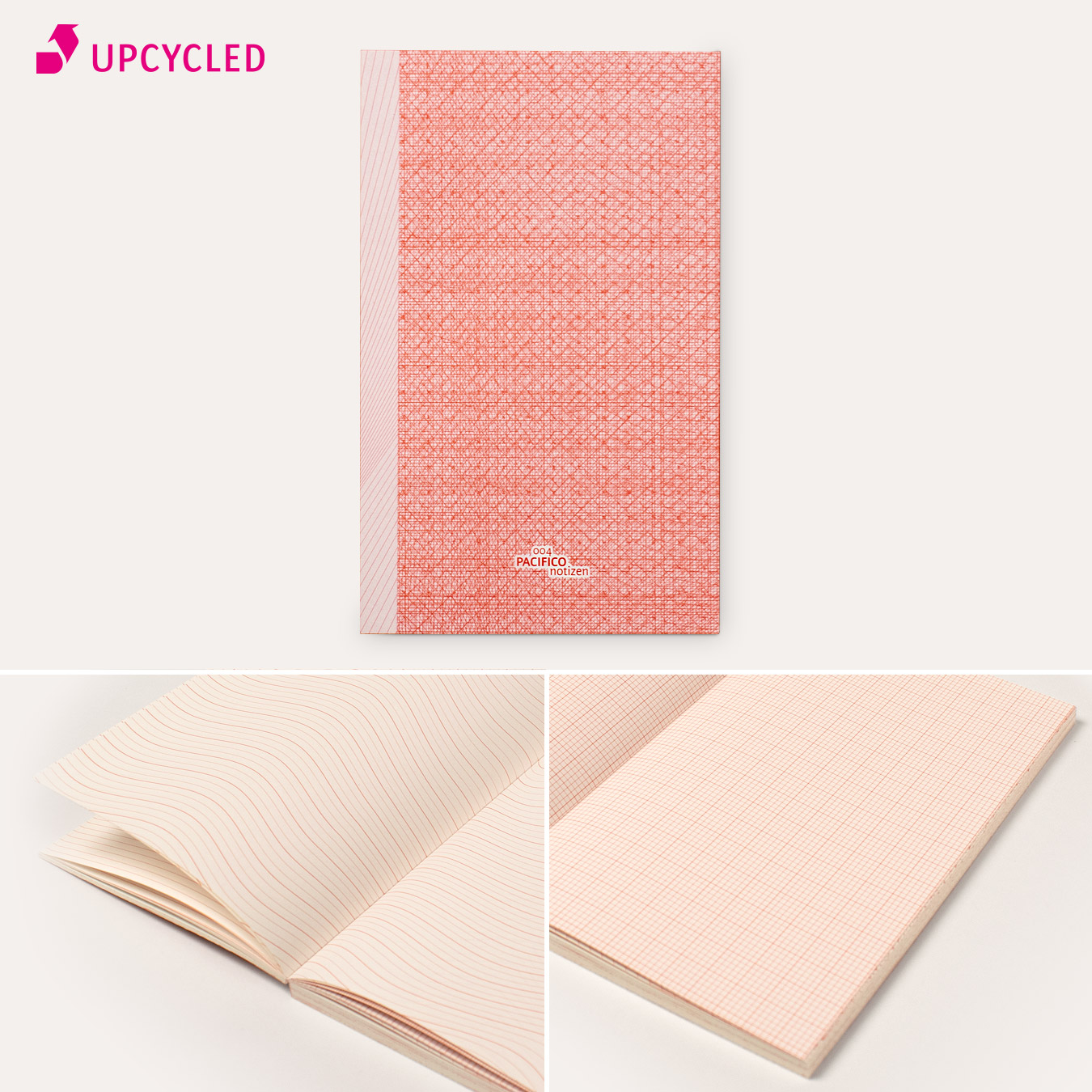 Upcycling: Für dieses rot-strahlende Notizbuch haben wir Papierreste aus der Druckherstellung unserer PACIFICOnotizen verwendet und sie zu einem inspirierenden, neuen Buch zusammengefügt: Circa 190 Seiten Munken pure lassen sich wunderbar beschreiben. Abwechslungsreich bedruckt sind sie mit 32 verschiedenen Rastermotiven: kariert, liniert, geschwungen, Millimeter- oder Notenlinien. Für jede Notiz der richtige Untergrund.